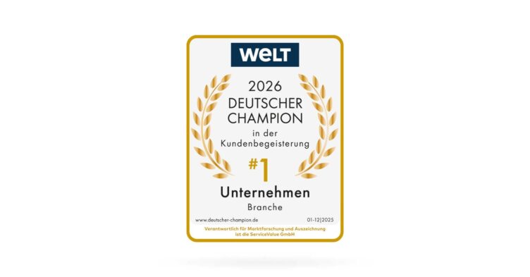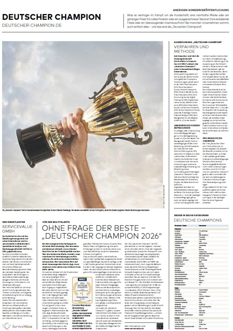 In Zusammenarbeit mit der WELT verleihen wir seit acht Jahren in Folge die Auszeichnung „Deutscher Champion“ an herausragende Unternehmen einer Branche. Hierbei fließen die Ergebnisse der jährlich durchgeführten Champions-Untersuchungen in die Bewertung ein: