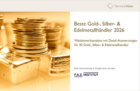 Die Studie „Kundenurteil: Fairness von Gold-, Silber- & Edelmetallhändler 2026“ kann über die ServiceValue GmbH bezogen werden. Die Wettbewerbsanalyse enthält Gesamtergebnisse sowie detaillierte Einzelprofile für 30 Gold- & Edelmetallhändler in Deutschland.