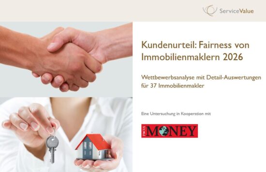 Die Benchmarkstudie „Kundenurteil: Fairness von Immobilienmaklern 2026“ kann über die ServiceValue GmbH bezogen werden. Die Wettbewerbsanalyse enthält Gesamtergebnisse sowie Detail-Auswertungen für 37 Immobilienmakler in Deutschland.