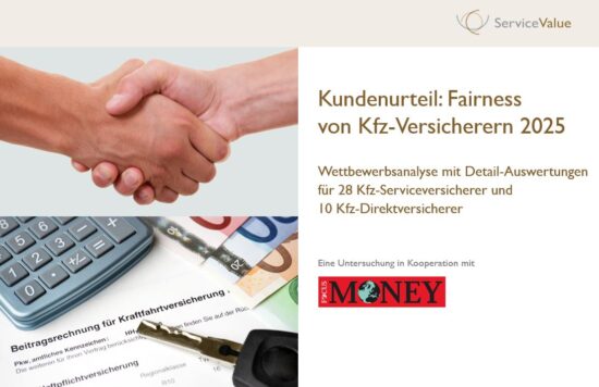Die Benchmarkstudie „Kundenurteil: Fairness von Kfz-Versicherern 2025“ kann über die ServiceValue GmbH bezogen werden. Die Wettbewerbsanalyse enthält Gesamtergebnisse sowie Detail-Auswertungen für die größten 28 Kfz-Serviceversicherer und die 10 größten Kfz-Direktversicherer.