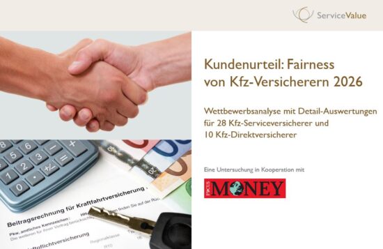 Die Benchmarkstudie „Kundenurteil: Fairness von Kfz-Versicherern 2026“ kann über die ServiceValue GmbH bezogen werden. Die Wettbewerbsanalyse enthält Gesamtergebnisse sowie Detail-Auswertungen für die größten 28 Kfz-Serviceversicherer und die 10 größten Kfz-Direktversicherer.
