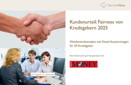 Die Benchmarkstudie „Kundenurteil: Fairness von Kreditgebern 2025“ kann über die ServiceValue GmbH bezogen werden. Die Wettbewerbsanalyse enthält Gesamtergebnisse sowie detaillierte Einzelprofile für 39 Geldinstitute in Deutschland.