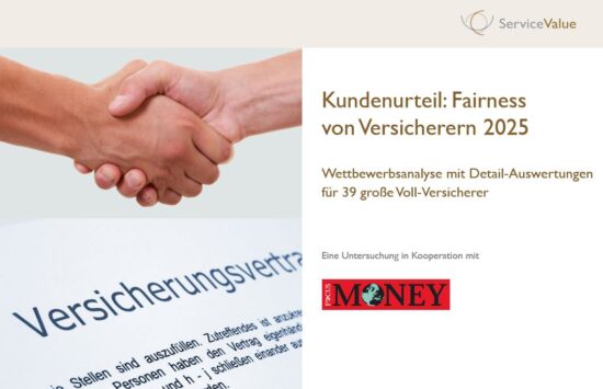 Die Benchmarkstudie „Kundenurteil: Fairness von Versicherern 2025“ kann über die ServiceValue GmbH bezogen werden. Die Wettbewerbsanalyse enthält Gesamtergebnisse sowie detaillierte Einzelprofile für die 39 größten Vollversicherer in Deutschland.